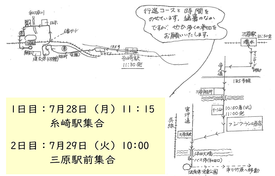 椛山会長は原水爆禁止日本協議会のパンフレットを使って、核兵器の禁止・廃絶へと動く世界の流れについて紹介。世界では、核兵器禁止条約を支えるように非核兵器地帯が広がっていること、被爆80年のいまこそ被爆国の役割を果たす日本に変えようと話し合いました。今年の平和行進は暑さ対策として、例年よりコースを短くして開催することから、参加者とコースを確認し、8月6日の原水爆禁止世界大会への参加者についても確認しました。平和行進のコースでは、今村さん(本町)と田中さん(港町)が平和行進のポスターを貼ってくれました。