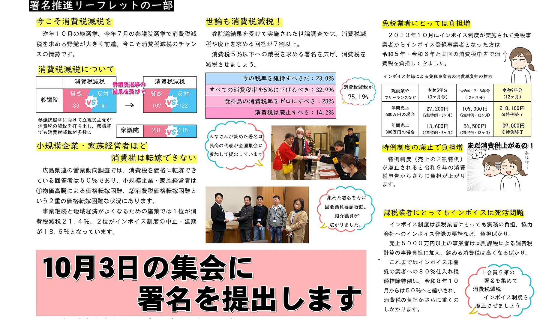 三原民商では署名を広げるためのリーフレットをつくりました。署名で対話を広げ、ご一緒に消費税減税・インボイス制度の廃止を目指しましょう。集めた署名は事務所や集金の当番さんに渡してください。